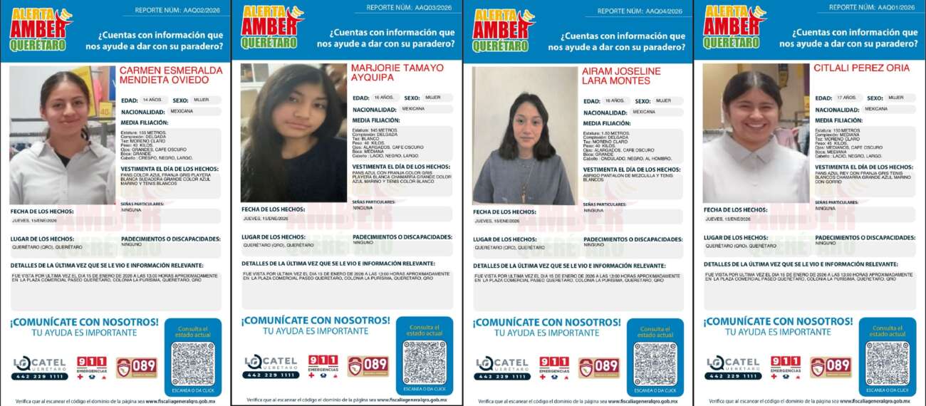 La Fiscalía General del Estado de Querétaro (FGEQ) activó la Alerta Amber por la desaparición de cuatro adolescentes, vistas por última vez el 15 de enero, alrededor de las 13:00 horas, en la Plaza Paseo Querétaro.